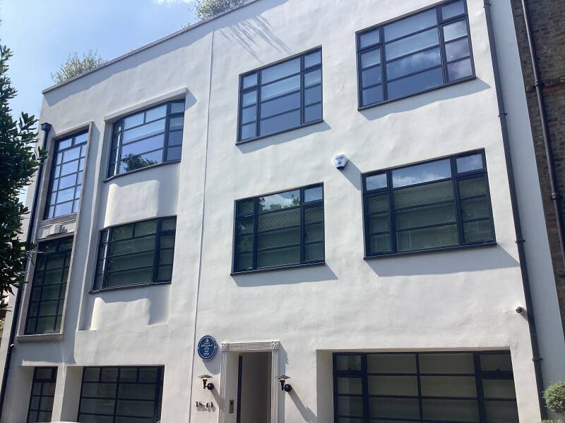 Constructed as purpose-built studios and residences for artists, the eight storey building was occupied by numerous creative types as recorded by the blue plaque on the side elevation. It is imaginatively sculpted: with projecting corner bays, stepping gable ends, generous irregular balconies, arches and windows of a wide variety of sizes, particularly large on the north elevation – which is perhaps where the studios were located. The building is now subdivided into flats and is Grade 2 listed.