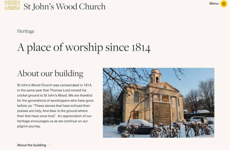 After bomb damage during the Second World War rendered St Stephen's, Avenue Road[9] unusable, St John's Wood Church became a parish church in its own right in 1952.[10] As well as holding regular services for the community, the church hosted the society wedding of Peggy Cripps to Joe Appiah in June 1953,[11] the blessing of the marriage of Paul and Linda McCartney in 1969,[12] and the funeral of Ursula Vaughan Williams in 2007.[13]